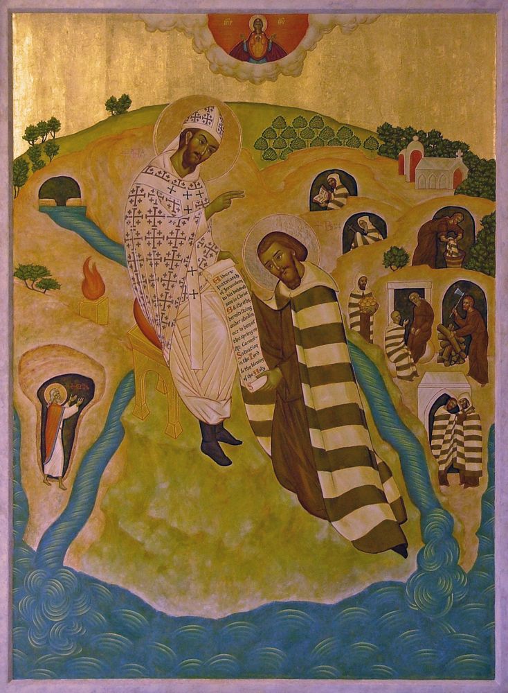 There are two images of Saint Brocard at the Shrine. In the image above is Saint Albert giving the Carmelite 'way of life' (Rule document) to Saint Brocard on Mount Carmel – an icon at the National Shrine of Saint Jude. For more information and to see the other image, please view our pages about the Shrine, here.