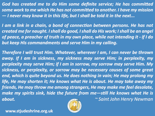 "God has created me to do Him some definite service; He has committed some work to me which He has not committed to another.  I have my mission – I may never know it in this life, but I shall be told it in the next.  I am a link in a chain, a bond of connection between persons.  He has not created me for naught.  I shall do good.  I shall do His work.  I shall be an angel of peace, a preacher of truth in my own place while not intending it – if I do but keep His Commandments.