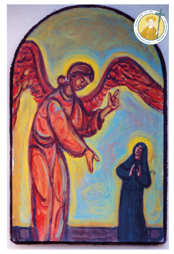 Pictured at the top is a painting by Adam Kossowski of The Annunciation, read more about his work at the Shrine, here. The image below is from one of the old prayer cards, printed in the Shrine in the 1950s and 1960s.