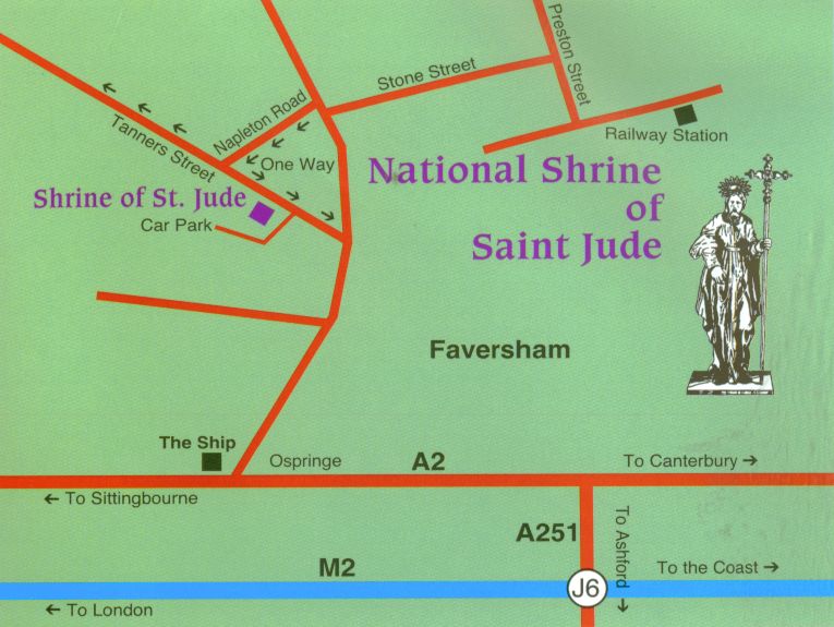 To reach the Shrine by foot (about a 10 minute walk), leave Faversham Railway Station and turn right into Preston Street.