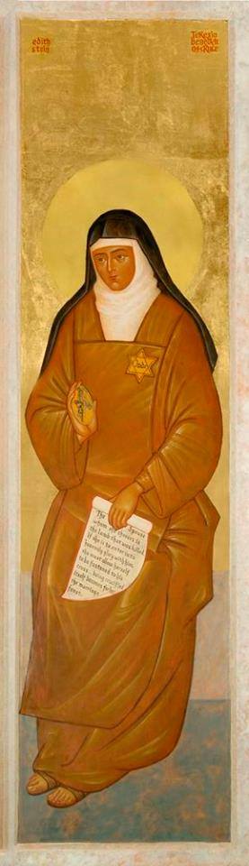 Edith was born to a Jewish family in Breslau in 1891. Through her passionate study of philosophy, she searched after truth. She declared that she had found the truth after reading the autobiography of Saint Teresa of Jesus (of Avila) in a single sitting. In 1922 Edith was baptised a Catholic, and continued her work as a philosopher and academic. In 1933 she entered the Carmel of Cologne to live as a nun. Like many of her fellow Jews, Edith suffered during the Nazi persecution of World War II. She was gassed and cremated at Auschwitz concentration camp on 9th August 1942, dying both as a Jewish woman and a martyr for the Christian faith, having offered her holocaust for the people of Israel. A woman of singular intelligence and learning, Edith left behind a body of writing notable for its doctrinal richness and profound spirituality. She was declared one of the six co-patron saints of Europe by Pope Saint John Paul II.