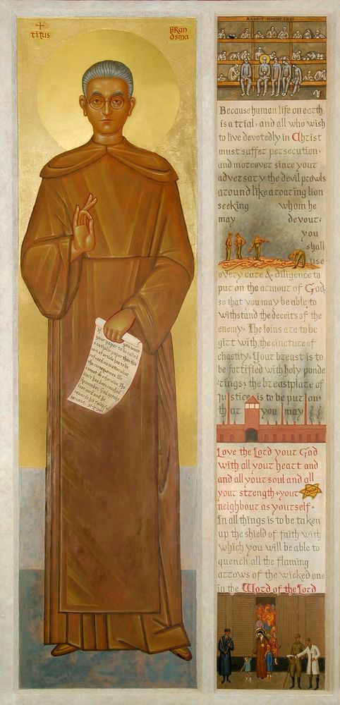 He was born as Anno Sjoerd Brandsma in Bolsward (The Netherlands) in 1881, and joined the Carmelite Order in 1898 taking the name ‘Titus’, eventually being ordained a priest in 1905. In time he became a professor and then Rector Magnificus at the Catholic University of Nijmegen. He was also a journalist. During the 1930s he gave a famous series of lectures in the United States on Carmelite mysticism. Throughout the 1930s Nazi propaganda was on the rise but Fr Titus refused to support or print anything in support of the Nazi regime. Fr Titus was arrested by the Gestapo on January 19, 1942, and imprisoned in his native country before being sent to the concentration camp at Dachau where he brought comfort and peace to his fellow prisoners. In Dachau he was experimented on in the medical wing and was finally put to death by lethal injection on July 26, 1942.