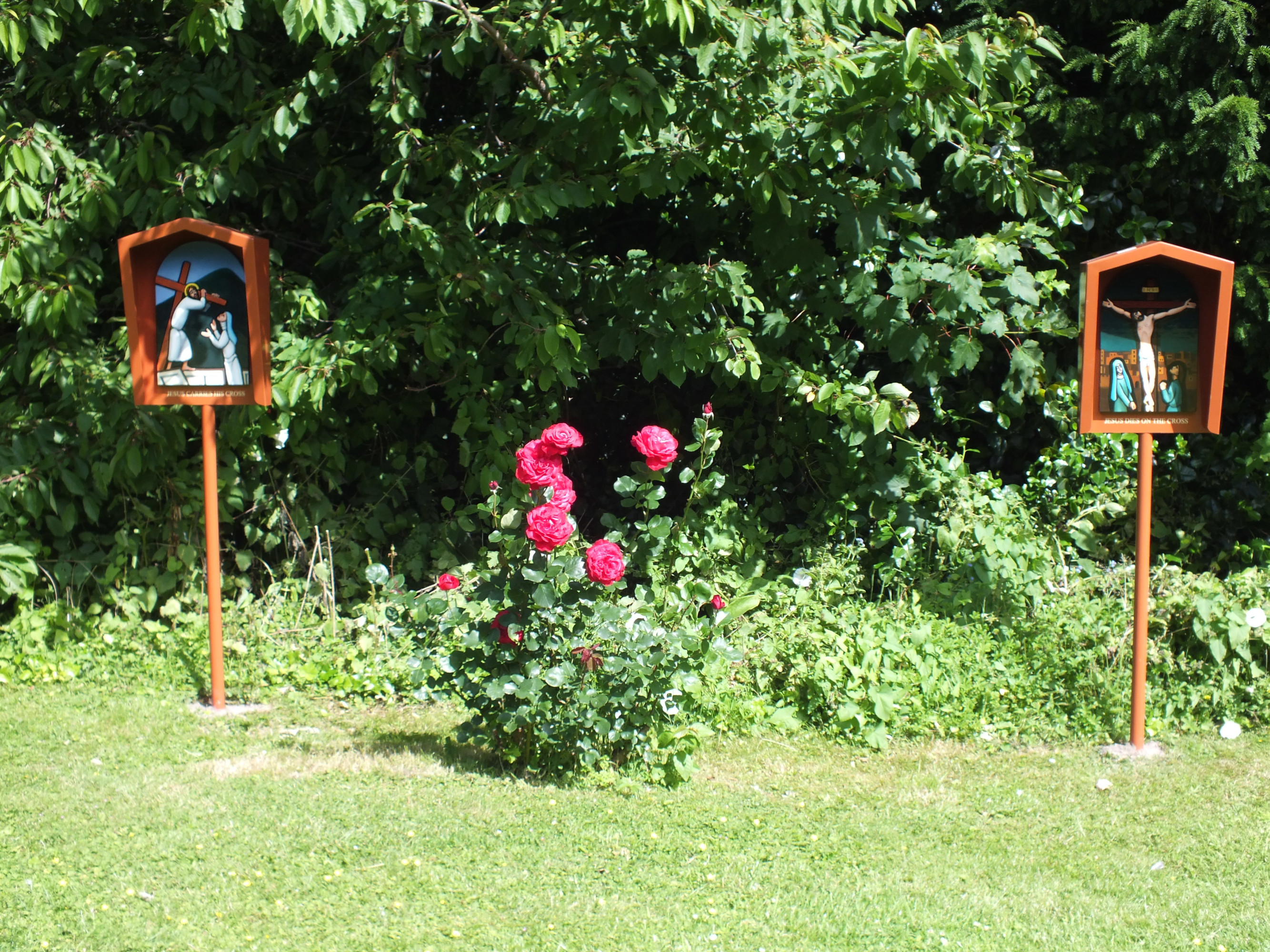 Adam Kossowski used acrylic paint for the Rosary Way paintings which were originally commissioned for the Carmelite retreat and pilgrimage centre at Hazlewood House in Yorkshire. They were moved to Faversham when the Carmelites left Hazelwood House in 1996. In 2007, it was noticed that the original artwork was showing signs of damage from being outside in all weathers and it was decided to attempt to preserve them immediately. They are now stored in the development manager’s office. Copies were commissioned and Mr Mic Redsell took on this work. His painted copies were put in their place for visitors to enjoy for many years to come.